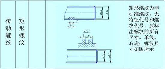 梯形螺紋和鋸齒形螺紋常用于傳遞運(yùn)動(dòng)和動(dòng)力的絲杠上。梯形螺紋工作時(shí)牙的兩側(cè)均受力,而鋸齒形螺紋在工作時(shí)是單側(cè)面受力。梯形螺紋和鋸齒形螺紋的標(biāo)記與普通螺紋類似。下為梯形螺紋的標(biāo)記示例: