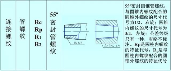 55°密封管螺紋的特征代號(hào):密封圓柱內(nèi)螺紋Rp,密封圓錐內(nèi)螺紋Rc,與圓柱內(nèi)螺紋相配合的圓錐外螺紋R1,與圓錐內(nèi)螺紋相配合的圓錐外螺紋R2。標(biāo)記示例如下: