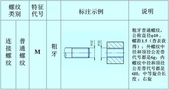 “M10”表示:公稱直徑為10 mm、螺距1.5 mm的單線粗牙普通螺紋。