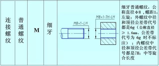 左旋時(shí)標(biāo)注LH,右旋時(shí)不標(biāo)注。例如:M10―7H―L ―LH 為左旋螺紋,M10―7H―L 為右旋螺紋。