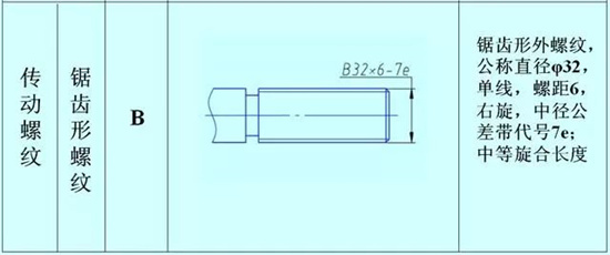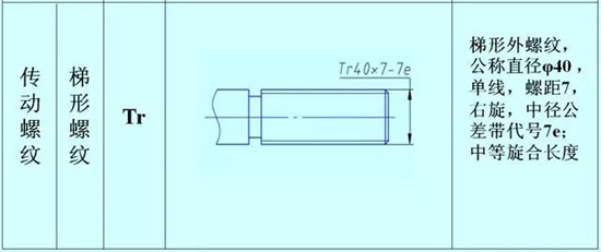 Tr40×7LH-7e:梯形螺紋(螺紋特征代號(hào)為T(mén)r),公稱直徑φ40 ,單線,螺距7,左旋,中徑公差帶代號(hào)7e;中等旋合長(zhǎng)度。