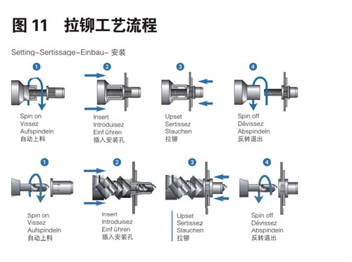 拉鉚標(biāo)準(zhǔn)件工藝過(guò)程包括四個(gè)階段:自動(dòng)上料、插入安裝孔、拉鉚、反轉(zhuǎn)旋出。如下圖 11 所示。