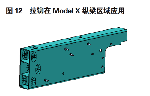 圖 12 為拉鉚螺母和拉鉚螺栓蔚來(lái) ES8 等車(chē)型上的應(yīng)用。拉鉚類(lèi)標(biāo)準(zhǔn)件廣泛應(yīng)用于封閉截面的鋁型材,開(kāi)口截面的鑄鋁零部件上。