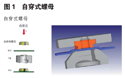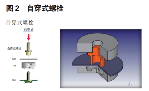 自穿式螺栓或螺母又稱(chēng)自沖鉚螺栓或螺母,其中自穿式標(biāo)準(zhǔn)件是通過(guò)端部翻邊結(jié)構(gòu)穿透板材并與之形成可靠互鎖結(jié)構(gòu)的冷成型工藝。其 結(jié)構(gòu)形式如圖 1、圖 2 所示。