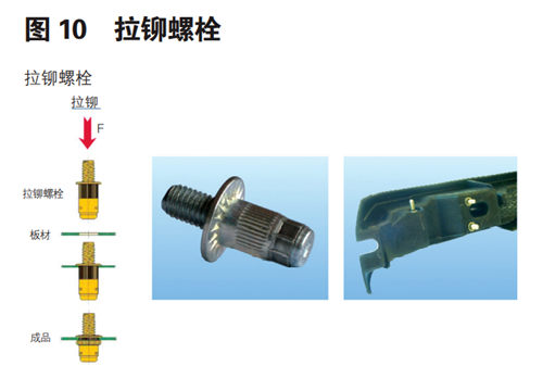 拉鉚是通過(guò)標(biāo)準(zhǔn)件頭部拉壓變形膨脹,與端部法蘭面上下夾住板材開(kāi)孔,形成一種穩(wěn)定可靠的標(biāo)準(zhǔn)件連接形式。用于各類(lèi)金屬板材、管材等制造工業(yè)的緊固領(lǐng)域;在鋁車(chē)身上應(yīng)用廣泛。其結(jié)構(gòu)形式如下圖 9、圖 10 所示。