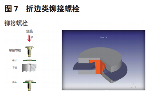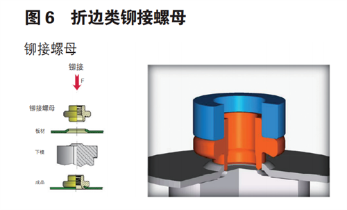 二、折邊類(lèi)互鎖壓鉚標(biāo)準(zhǔn)件主要是通過(guò)標(biāo) 準(zhǔn)件底部的翻邊結(jié)構(gòu)與開(kāi)孔板材面在壓頭作用下,固有模具下擠壓翻邊折彎成型互相嵌套,形成互鎖結(jié)構(gòu),完成標(biāo)準(zhǔn)件與板材的連接。其結(jié)構(gòu)形式如下圖 6 和圖 7 所示。