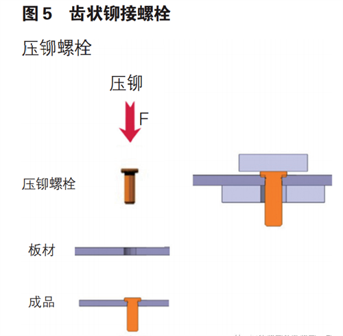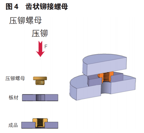 鉚接又稱(chēng)壓鉚,又叫自扣緊,是一種與板材通過(guò)法向結(jié)構(gòu)或者徑向結(jié)構(gòu)互鎖的標(biāo)準(zhǔn)件連接形式。主要有齒狀互鎖壓鉚和折邊互鎖壓鉚兩種??蓮V泛應(yīng)用于鋁合金車(chē)身的沖壓件,擠出件和鑄造件各類(lèi)零部件上。以下內(nèi)容分別介 紹上述兩種常見(jiàn)類(lèi)型的鉚接標(biāo)準(zhǔn)件。