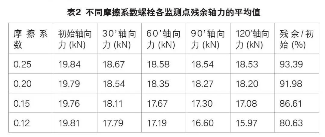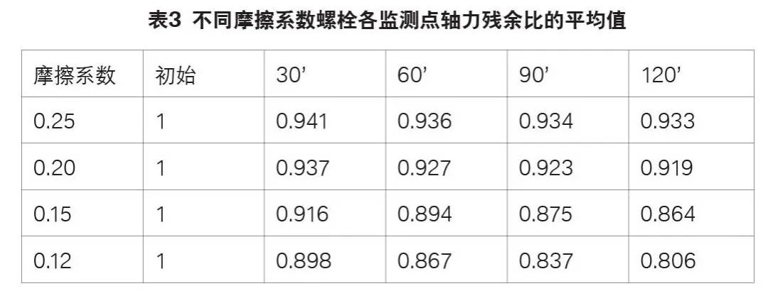 摩擦系數(shù)較小的螺栓,在相同扭矩下得到的預(yù)緊力較大,但自身防松效果較差??梢?,螺栓摩擦系數(shù)的選取是一個平衡防松性能與強(qiáng)度效能利用的矛盾問題。