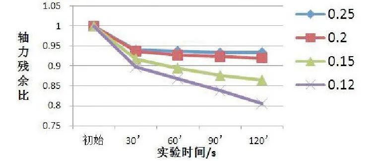 整個實驗過程中所用到的實驗樣件均由同一個生產(chǎn)廠家提供,保證材料、加工工藝等方面的一致性:實驗環(huán)境始終保持在常溫(出現(xiàn)個別天氣變化的情況要更改實驗進(jìn)度計劃);實驗儀器中選擇的頻率為12.5 Hz,空載振幅為±0.8 mm;實驗終止條件為振動時間達(dá)到120s或者殘余軸向力減少至零。本實驗利用橫向振動試驗機(jī),該試驗機(jī)可以測量出螺栓擰緊過程中的夾緊力、螺紋副上的扭矩以及分階段測出軸向力的變化,并對軸向力衰減做出一個實時反映。實驗采用的方法是單一變量的原理,整個實驗過程中唯一的變量是螺栓的摩擦系數(shù)(由表面處理不同來體現(xiàn))。實驗共分為4組,每組各做10次實驗,每次實驗都要更換新的樣件及工裝夾具。每組實驗保證在初始軸向力相同的情況下(19.5 kN),分別記錄30s、60s、90s、120s的軸力變化,最終獲得各組螺栓的軸力殘余比。根據(jù)記錄數(shù)據(jù)的分析和對比可以判定緊固件的防松性能。在實驗過程中,夾緊力衰減的越慢(殘余比越大),防松性能越好;反之,夾緊力衰減越快(殘余比越小),防松性能越差。1)對實驗數(shù)據(jù)進(jìn)行整理,得到不同摩擦系數(shù)的螺栓在振動過程中各監(jiān)測點的殘余軸向力均值,如表2。通過表2可以得出,隨著實驗時間的推移,各組螺栓的殘余軸向力都有不同程度的衰減,且當(dāng)摩擦系數(shù)由0.25降至0.12時,對應(yīng)的軸力殘余比也依次降低,根據(jù)前面的分析可得,其對應(yīng)的螺栓防松性能也依次下降。2)為了能更加直觀地表現(xiàn)出螺栓所受軸向力衰減與摩擦系數(shù)的關(guān)系,對實驗數(shù)據(jù)進(jìn)行整合處理,得到各監(jiān)測點殘余軸向力與初始軸向力百分比的平均值,如表3;并將不同摩擦系數(shù)下的各監(jiān)測點軸力殘余比擬合成了四條曲線,如圖2。圖2 不同摩擦系數(shù)下各監(jiān)測點軸力殘余比變化趨勢通過表3對四種摩擦系數(shù)下得到的螺栓實驗數(shù)據(jù)的對比,以及圖2表示的不同摩擦系數(shù)下各監(jiān)測點軸力比的變化趨勢,可以得出以下測試結(jié)果。對于高強(qiáng)度螺栓(強(qiáng)度等級≥8.8)緊固過程中,在保證擰緊的前提下(初始軸向力一般為屈服軸向力的75%左右),以上四種摩擦系數(shù)的螺栓最終的軸力殘余比均≥80%,可見以上四組螺栓均具有一定的防松能力,但防松的性能有一定的差異;以上4種摩擦系數(shù)的螺栓在經(jīng)歷120s的橫向振動后,軸向力都有衰減的趨勢,但4組螺栓的軸力衰減程度不同。摩擦系數(shù)高(0.25)的螺栓,在到達(dá)30s過后,衰減曲線幾乎趨于水平,軸力衰減相對較平緩,防松性能較好;摩擦系數(shù)低(0.12)的螺栓,經(jīng)歷120s的實驗過程中,衰減曲線始終呈現(xiàn)坡度下降的趨勢,軸力衰減相對較快,防松性能相對較低。通過理論分析,得出摩擦系數(shù)是影響螺栓防松性能的一個關(guān)鍵性因素。摩擦系數(shù)較高時,螺栓的防松性能相對較好,即在防松方面的連接可靠性較高;反之,摩擦系數(shù)較低時,螺栓防松性能相對較差,即在防松方面的連接可靠性相對較低。當(dāng)然,影響螺栓防松性能的因素不單是摩擦系數(shù),同樣摩擦系數(shù)也不單只對螺栓防松性能起作用,它對螺栓擰緊過程中的扭矩系數(shù)、扭矩的轉(zhuǎn)換等也有直接關(guān)系。總之,摩擦系數(shù)的選取是一個平衡防松性能與強(qiáng)度效能利用的矛盾問題,本文只針對摩擦系數(shù)對螺栓防松性能的影響做了詳細(xì)的研究分析,具體螺栓摩擦系數(shù)的最終選取需要在此基礎(chǔ)上,根據(jù)螺栓的型號、使用場合等因素綜合考慮。