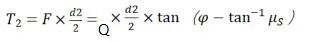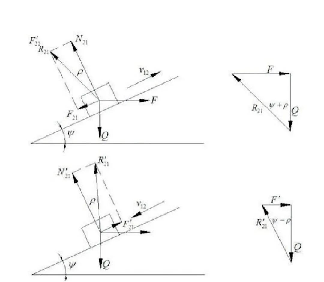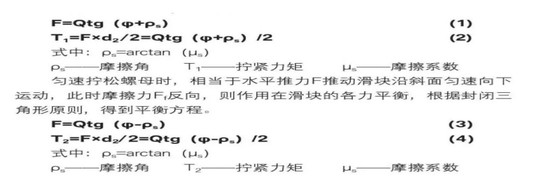 相互配合的螺紋之間受到的是一種復(fù)合力的作用,為了分析方便,以矩形螺紋作為研究對象。螺紋副中,螺母所受到的軸向載荷Q沿螺紋各圈平均分布,為便于分析,用集中載荷Q代替,并設(shè)Q作用在中徑為d2圓周上的一點。將矩形螺紋沿中徑d2展開,得到斜角等于螺紋升角的斜面。當(dāng)螺母相對于螺桿等速旋轉(zhuǎn)時,可看作一個滑塊(螺母)沿著斜面作等速滑動,如圖1。擰緊螺母時,相當(dāng)于水平推力F推動滑塊沿斜面向上滑動,它的作用方向與d2的圓周相切,運動過程中還受到接觸面的摩擦力Ff、軸向載荷Q。