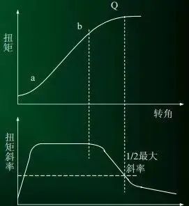 螺栓在擰緊的過程中,其扭矩/轉(zhuǎn)角的變化曲線見扭矩、扭矩斜率對比圖。真正的擰緊開始時,斜率上升很快,之后經(jīng)過簡短的變緩后而保持恒定( a_b區(qū)間)。過b點后,其斜率經(jīng)簡短的緩慢下降后,又快速下降。當(dāng)斜率下降一定值時(一般定義,當(dāng)其斜率下降到最大值的二分之一時),說明已達(dá)到屈服點(即扭矩對比圖中的Q點),立即發(fā)出停止擰緊信號。屈服點控制法的擰緊精度是非常高的,其預(yù)緊力的誤差可以控制在±4%以內(nèi),但其精度主要是取決于螺栓本身的屈服強(qiáng)度。