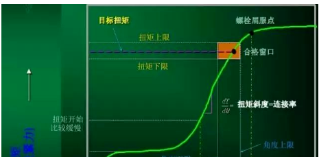 扭矩斜率法是以扭矩-轉(zhuǎn)角曲線中的扭矩斜率值的變化作為指標(biāo)對初始預(yù)緊力進(jìn)行控制的一種方法。該擰緊方法通常把螺栓的屈服緊固軸力作為控制初始預(yù)緊力的目標(biāo)值。該擰緊方法一般在螺栓初始預(yù)緊力離散度要求較小并且可最大限度地利用螺栓強(qiáng)度的情況下使用。
