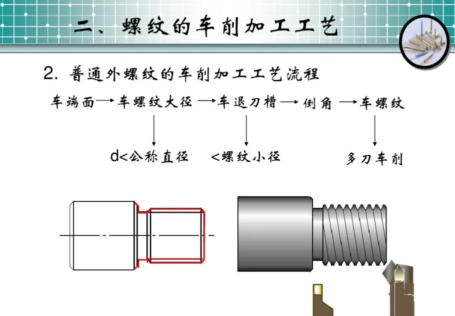 一般沒有指定牙型尺寸時,就把螺紋牙的斷面做成正方形。車刀直線進給加工矩形螺紋,按溝槽的深度(牙的高度)尺寸加工就行了。