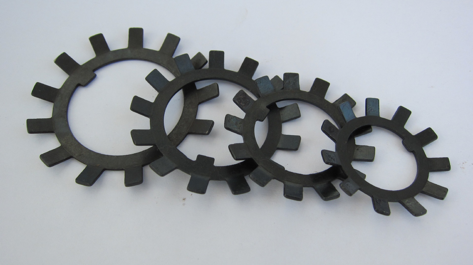 墊圈和圓螺母配套使用,使用時墊圈裝在螺母開槽的那一側(cè),緊固后將內(nèi)外止動耳折彎放到槽里。圓螺母緊固后,分別將內(nèi)外耳朵扳成軸向,分別卡在軸上的鍵槽和圓螺母的開口處,這樣,圓螺母就不會由于軸的轉(zhuǎn)動而松脫。