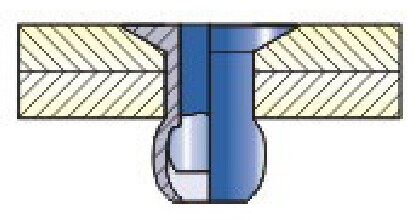 在產品板面被鉚接前,需要在被鉚接的板面鉆沉孔,凹下去的形狀,準確來說就是120度的沉孔,有的開孔是90度,也有開135度的,具體要根據工件沉孔要求來制作抽芯鉚釘帽沿角度,不論角度多大,都像一個喇叭形狀的孔,因此也有很多客戶叫喇叭孔,孔的內側凹下去的位置,剛好跟沉頭抽芯鉚釘帽檐凸起的那一部分銜接,恰到好處.因此可以這樣理解,沉頭抽芯鉚釘的帽子邊沿部分就留在了有角度的喇叭孔(也叫做沉孔)里面,鉚接工作完成后,帽檐部分沉到了喇叭孔(沉孔)里,整個鉚接板面就是平整的,貼合的。