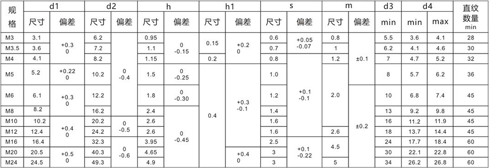 常用規(guī)格:M3,M3.5,M4,M5,M6,M8,M10,M12,M16,M20,M24等。