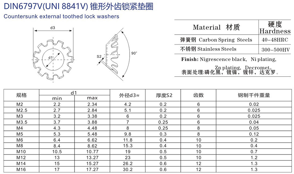 錐形外齒鎖緊墊圈 V型 DIN6797V 產(chǎn)品參數(shù)