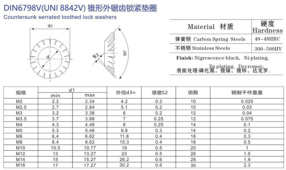 錐形外鋸齒鎖緊墊圈 V型 DIN6798V 產品參數(shù)
